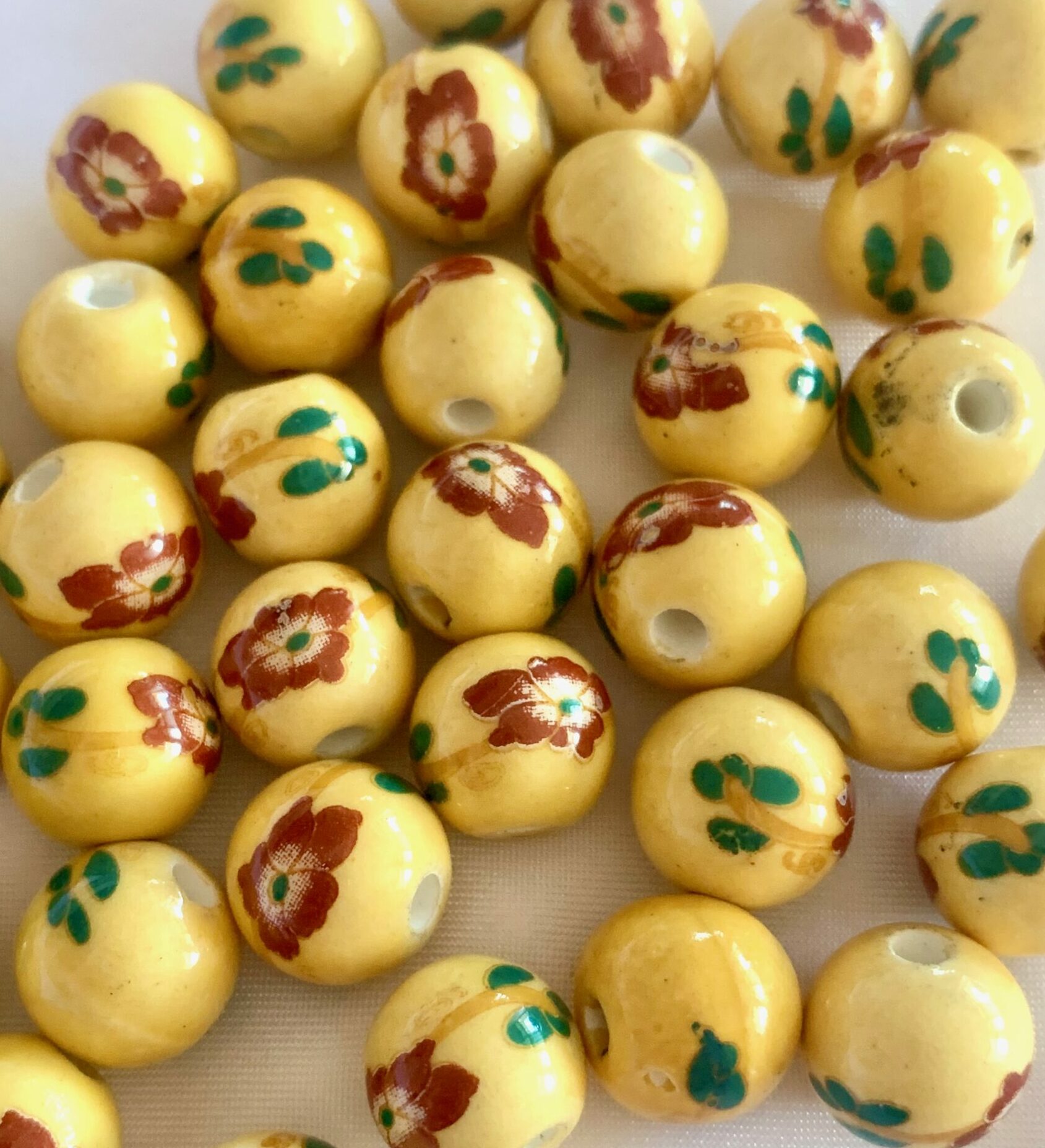 Beautiful Chinese ceramic beads that feature machine printed red flowers on a cream yellow background